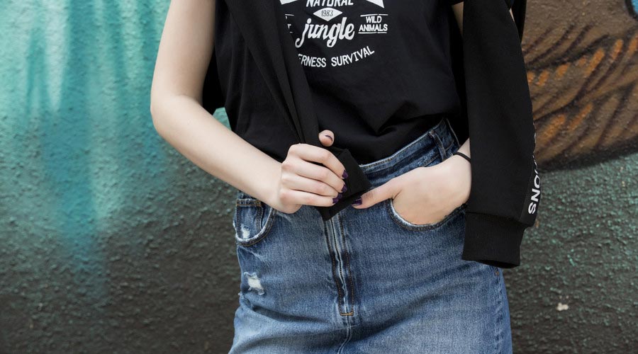 黑色T恤配牛仔裤